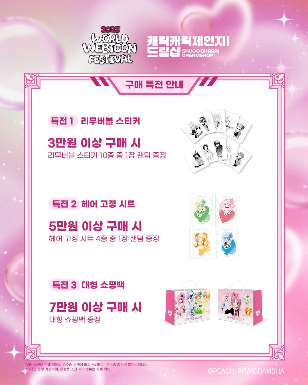 특전도 준비되어있습니다! 3만원/5만원/7만원 이렇게 각각 리무버블 스티커/헤어 고정 시트/대형 쇼핑백을 준다고 하네요!