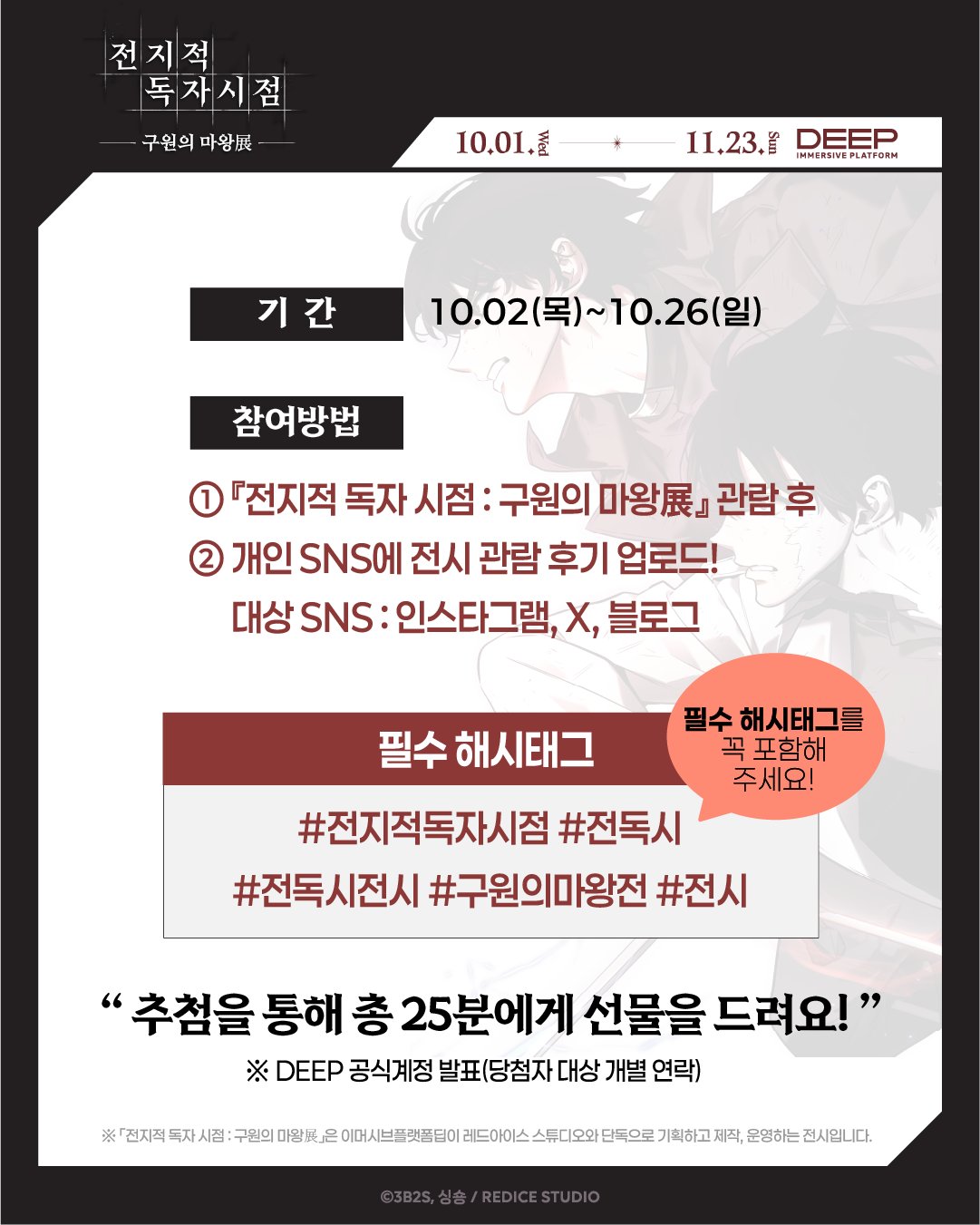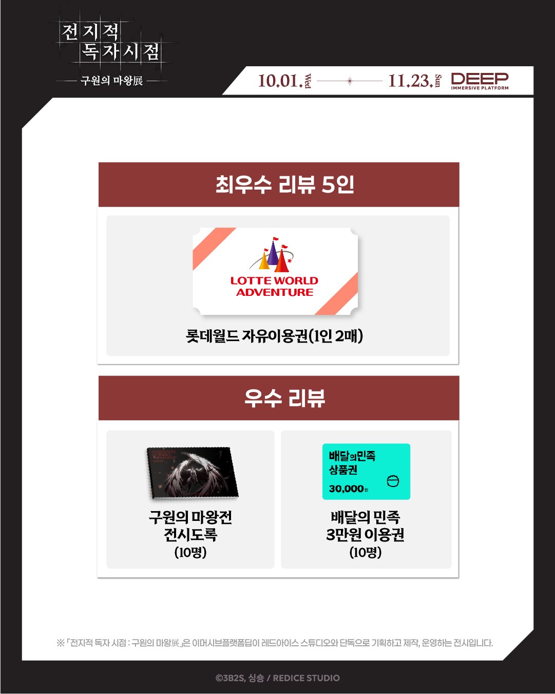 특별히 관림후기 이벤트도 열어주셨어요ㅎㅎ 개인 SNS(인스타그램, X, 블로그)에 필수 해시태그를 넣어서 게시하시면 추첨을 통해 25분께 롯데월드 자유이용권(5명), 구원의 마왕전 전시도록(10명), 배달의 민족 3만원권(10명)을 준다고 합니다!