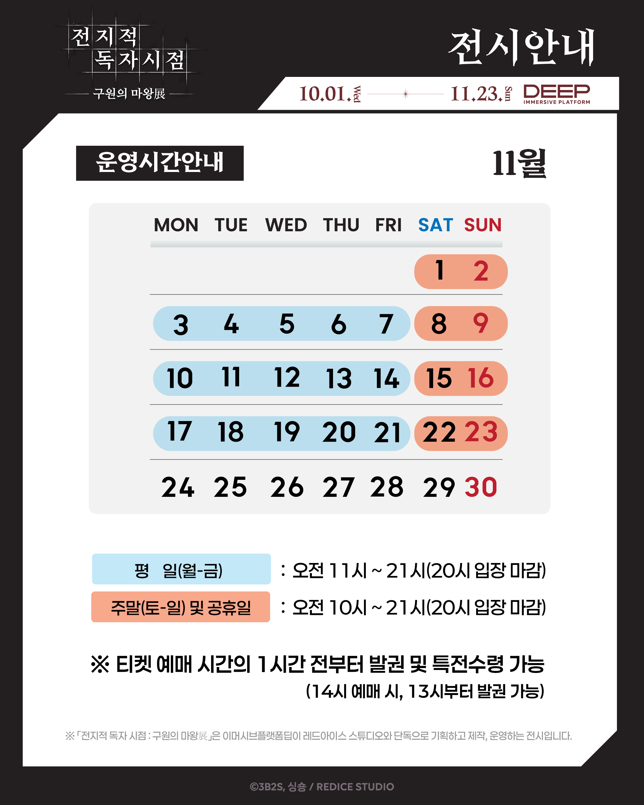 주말, 공휴일 10:00 - 21:00 (입장마감 20:00)